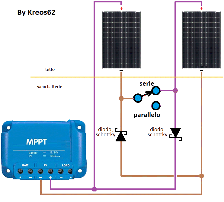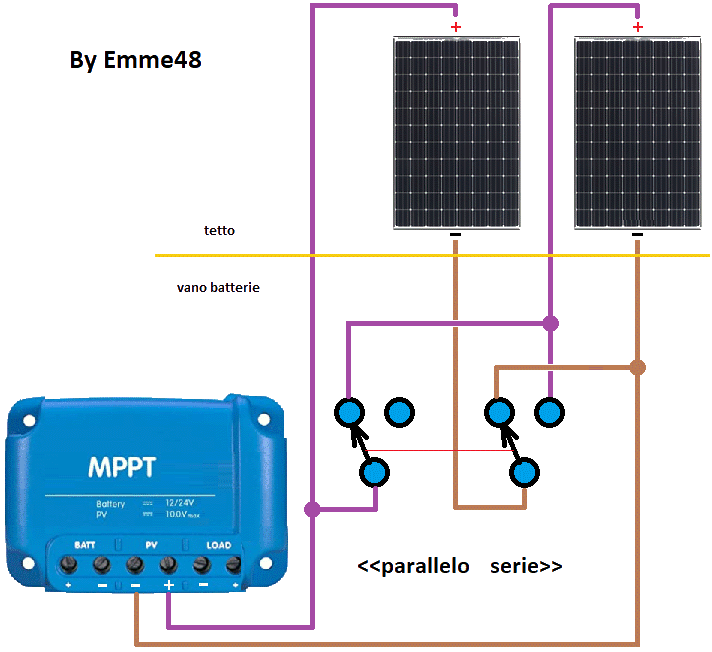 Questo schema permette di installare un commutatore in prossimità del regolatore per configurare i pannelli con collegamento in serie (ottimizzato per l'inverno) oppure in parallelo (più efficiente in estate).