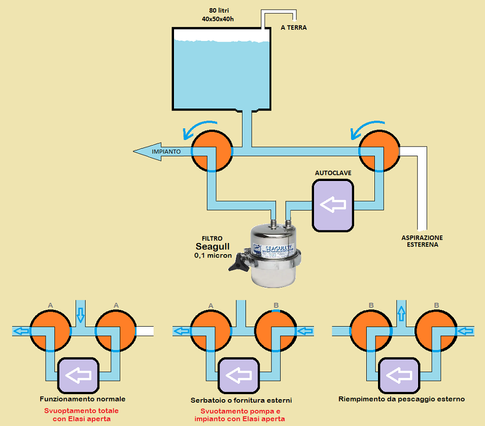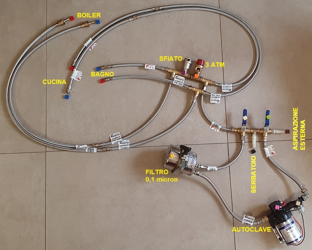 Le pendenze sono fatte in modo che il punto più basso sia il BOILER dove c'è un ulteriore tubo in basso collegato alla valvola ELASI che poi prosegue per l'acqua del WC Thetford dotato di una sua elettrovalvola azionata da un pulsante.