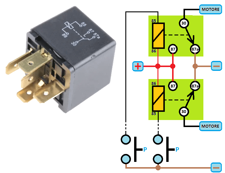 Nel caso che vengano premuti entrambi i pulsanti, arrivano due positivi al motore e non c'è nessun movimento meccanico, questo significa che lo schema gestisce il "conflitto" tra i due pulsanti eventualmente premuti insieme, per cui possono essere installate anche più coppie di comandi sparse per il camper, ad esempio un secondo comando dello scalino posizionato vicino al posto guida.