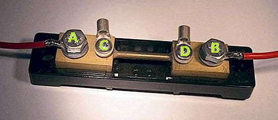 Nella foto vediamo uno shunt cone due viti più grandi (A e B) dove deve passare la corrente che voglliamo misurare,