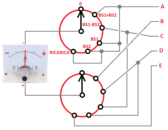 Lo strumento (millivoltmetro analogico oppure digitale) va collegato così ad un commutatore rotativo a 2 vie e 6 posizioni: